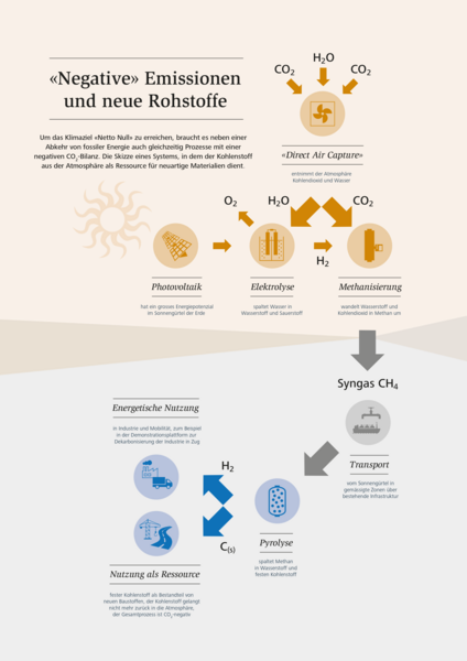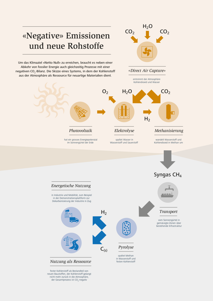 Verwendet man anstelle von Erdgas synthetisches Methan, dann lassen sich über den ganzen Prozess sogar negative Treibhausgasemissionen realisieren. Und zwar deshalb, weil für die Herstellung von synthetischem Methan CO2 aus der Atmosphäre entnommen wird, das nicht mehr emittiert, sondern in Form von festem Kohlenstoff zur Verfügung steht. «Dass wir den gewaltigen Energiebedarf unserer Industrie durch eine inländische Produktion von erneuerbarem Wasserstoff oder synthetischem Methan decken können, ist allerdings nicht realistisch», sagt Bach. Der Blick richtet sich deshalb in die Wüstenregionen der Erde – dorthin also, wo im Vergleich zur Schweiz eine doppelt so hohe Sonneneinstrahlung pro Quadratmeter erfolgt.